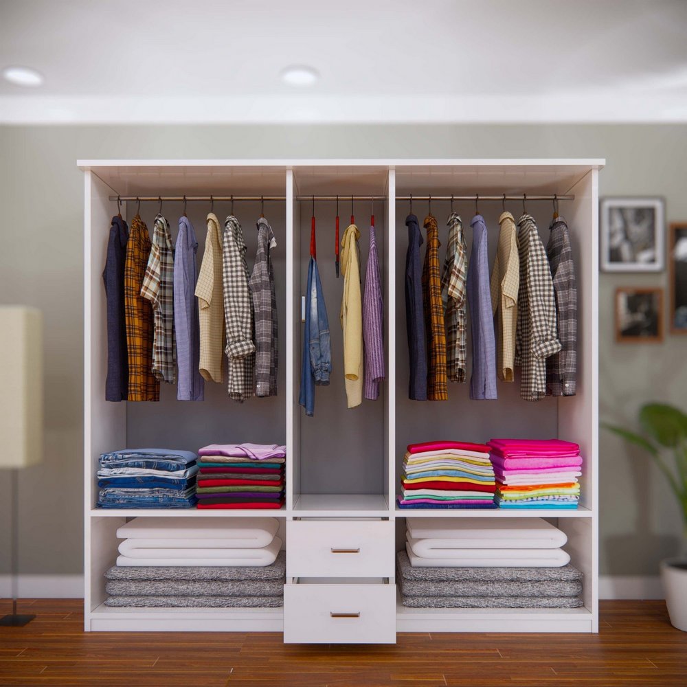 Tủ được thiết kế với 3 buồng treo quần áo, 2 ngăn kéo và 2 ngăn trống để đồ gấp, giúp bạn dễ dàng phân loại và sắp xếp quần áo, phụ kiện một cách gọn gàng. Không gian trên cùng của tủ cũng là nơi lý tưởng để đựng chăn màn hoặc các vật dụng ít dùng, giúp tận dụng tối đa diện tích.